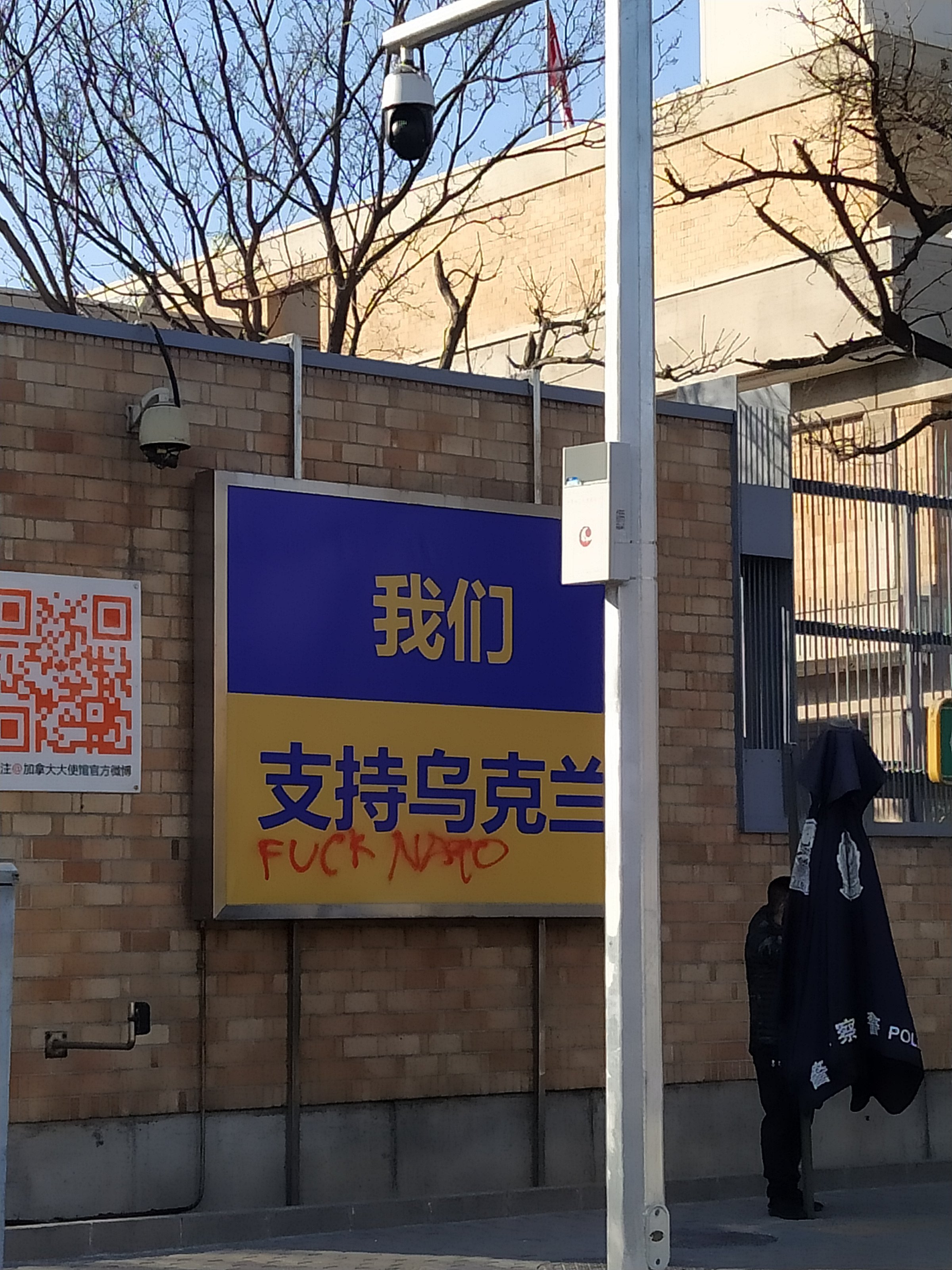Like, “The #SupportUkraine posters outside of Canada’s embassy in Beijing have been defaced with an anti-NATO slogan” is such a vivid picture of it all: